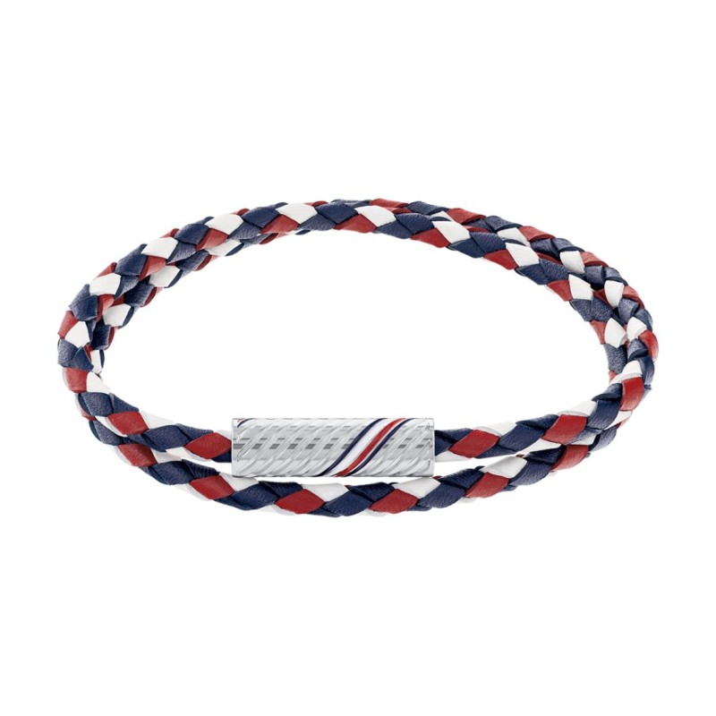 Ce bracelet TOMMY HILFIGER pour homme est fabriqué en cuir blanc, bleu et rouge avec fermoir aimant en acier inoxydable.