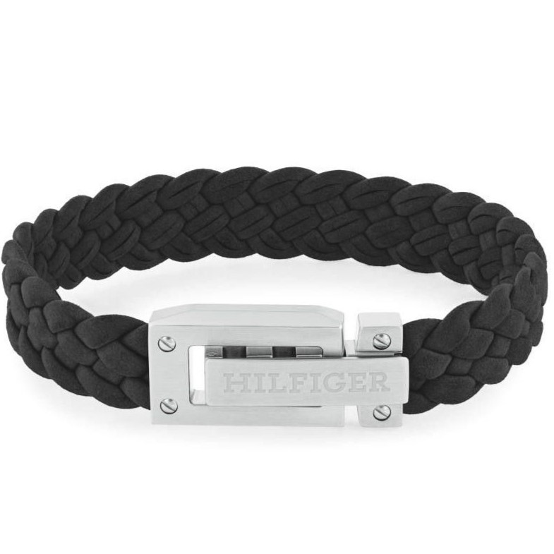 Ce bracelet TOMMY HILFIGER pour homme est fabriqué en cuir noir tressé et fermeture à rabat .