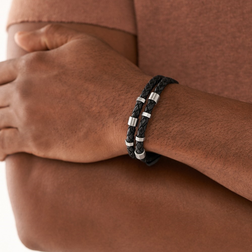 Ce bracelet est fabriqué en cuir noir avec un fermoir à Boucle.