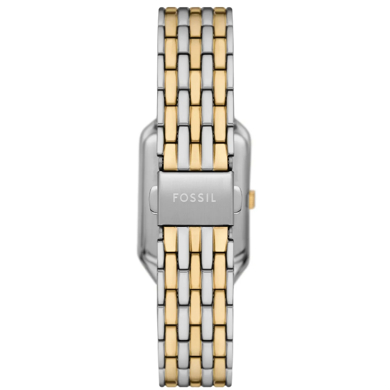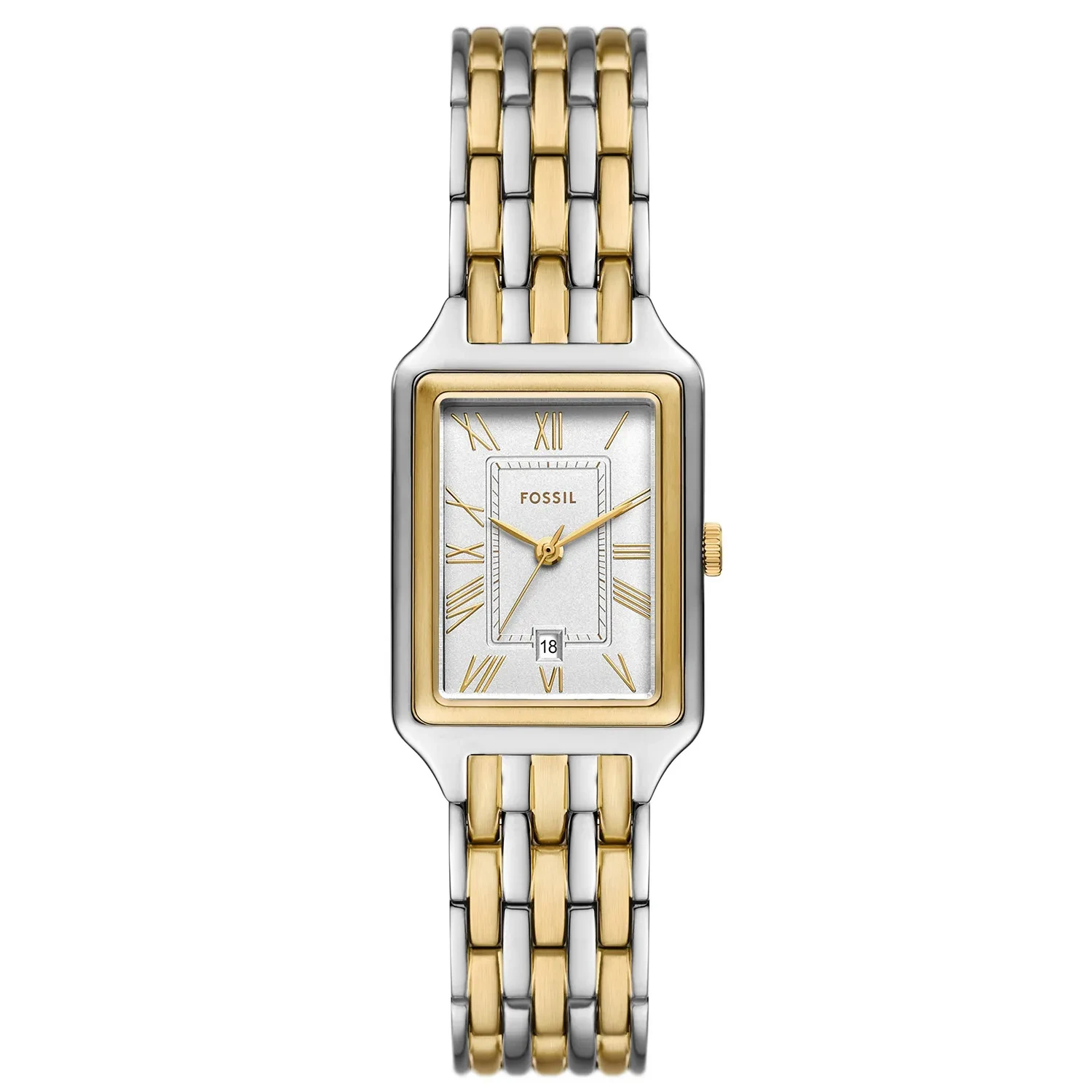 Montre Fossil femme de la collection Raquel , mouvement Quartz , 3 aiguilles avec date , boitier en Acier inoxydable argent de 23mm avec un cadran blanc sur bracelet Acier inoxydable argent et doré.