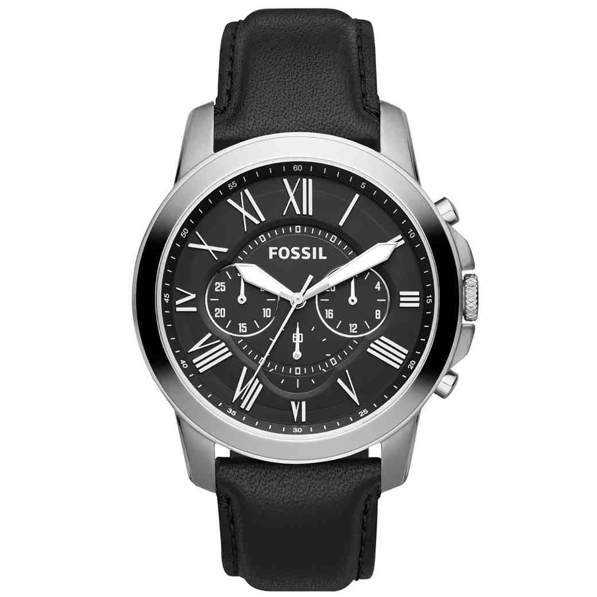 Montre Fossil homme de la collection Grant , mouvement Multifonction à Quartz, 3 aiguilles , boitier en acier inoxydable Argent de 44 mm avec un cadran Noir sur bracelet en Cuir Noir.