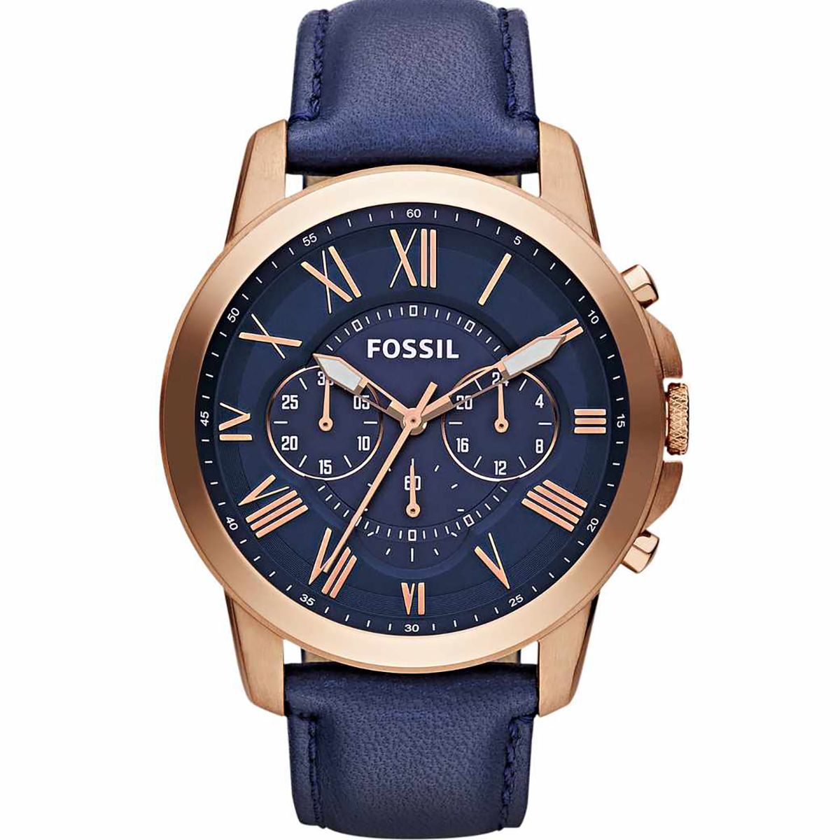 Montre Fossil homme de la collection Grant , mouvement Multifonction à Quartz, 3 aiguilles , boitier en acier inoxydable Argent de 44 mm avec un cadran Bleu sur bracelet en Cuir Bleu .