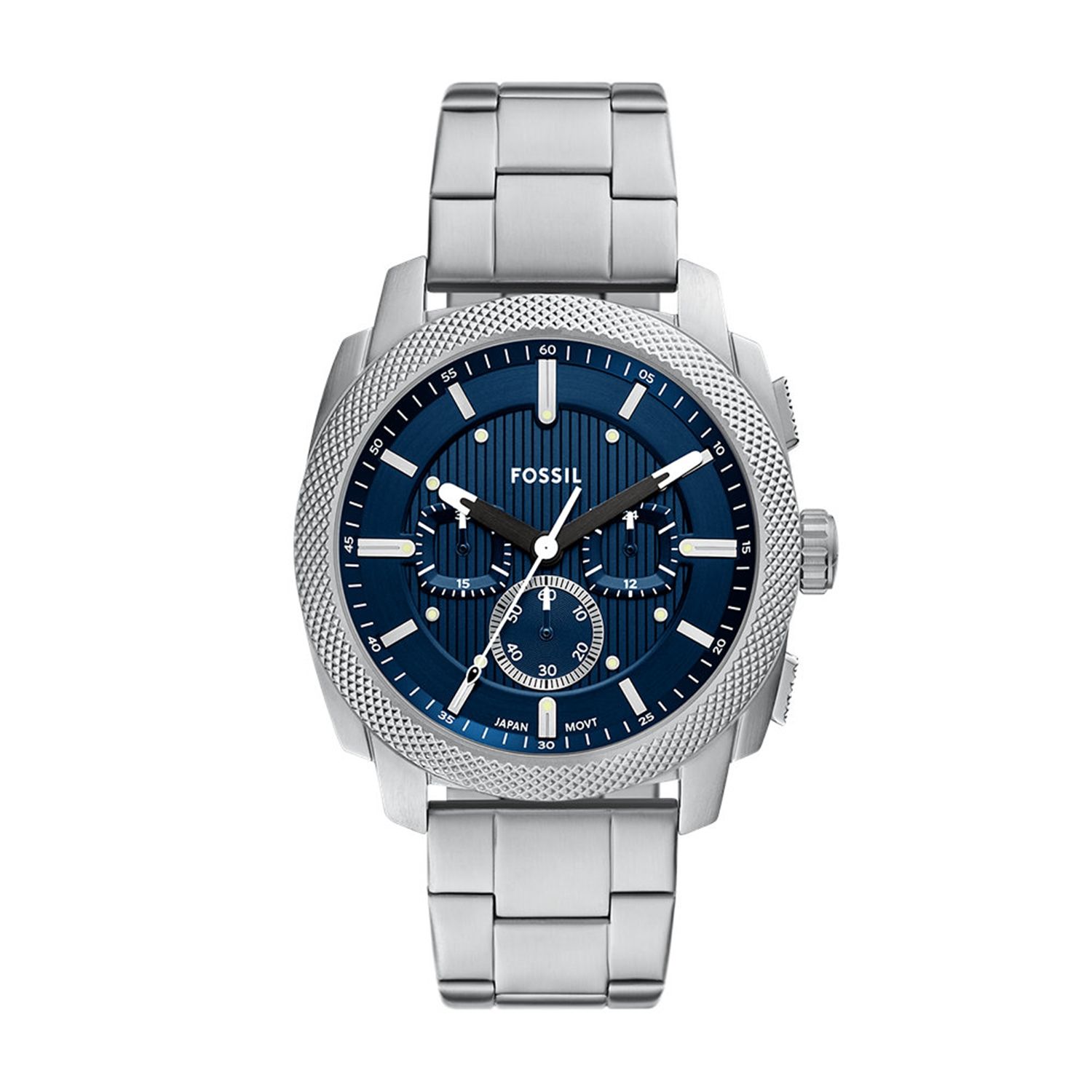 Montre Fossil homme de la collection Machine , mouvement Chronographe à Quartz, 3 aiguilles avec date , boitier en acier inoxydable argent de 44 mm avec un cadran bleu sur bracelet en acier inoxydable argent.
