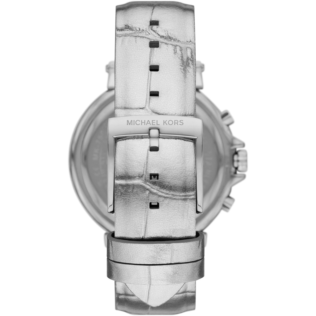 Montre MICHAEL KORS pour femme de la collection Maren , mouvement Chronographe à Quartz, 3 aiguilles avec date , boitier en acier inoxydable argent de 40 mm avec un cadran argenté sur bracelet en cuir argent.