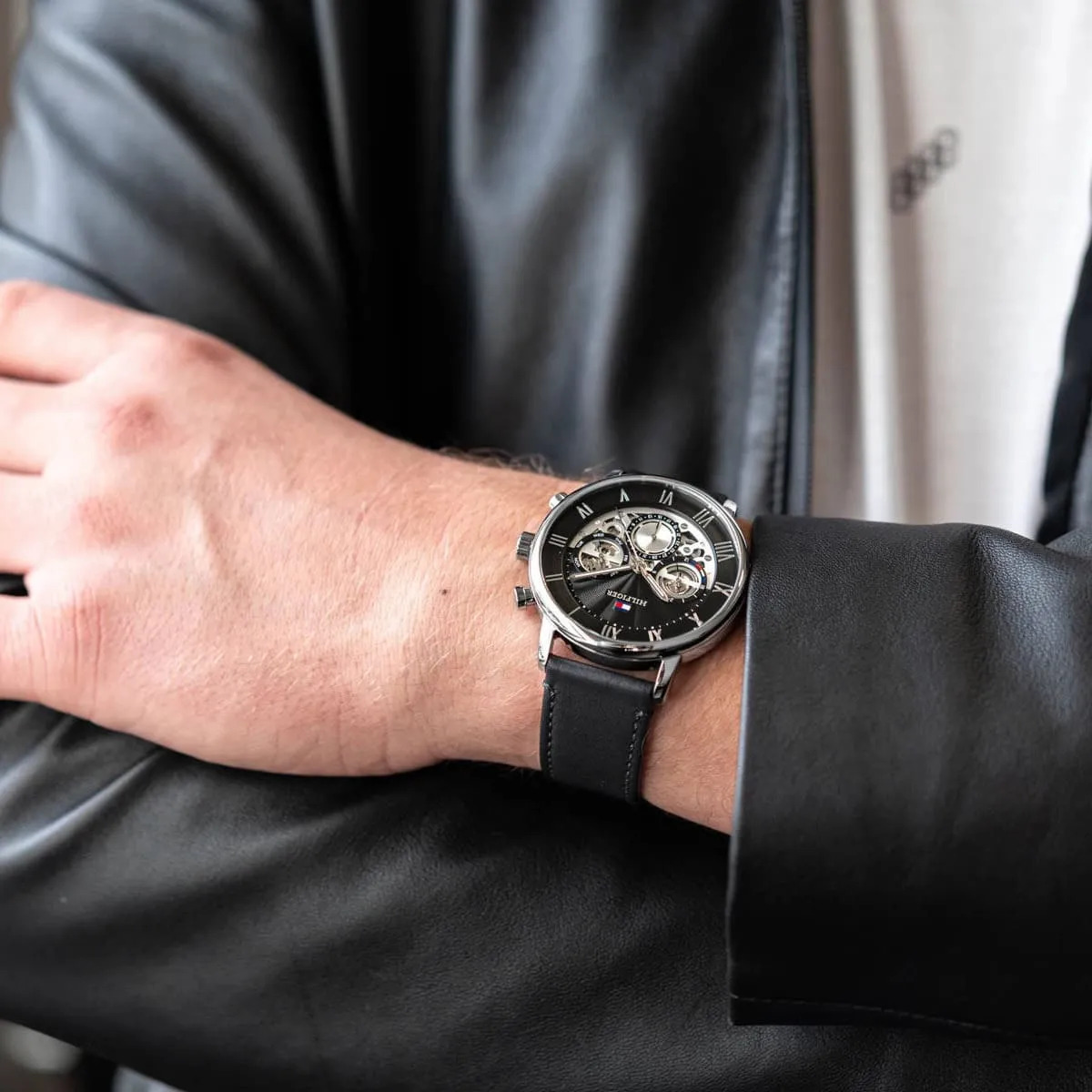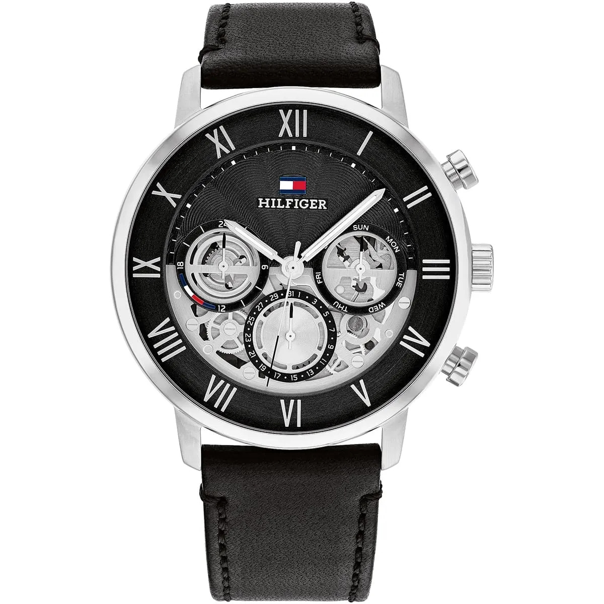 Montre Homme Tommy Hilfiger Réf 1710565 ,Collection Legend, mouvement multifonction à quartz ,3 aiguilles, boitier en acier inoxydable argent de 44mm avec un cadran noir sur bracelet cuir noir.