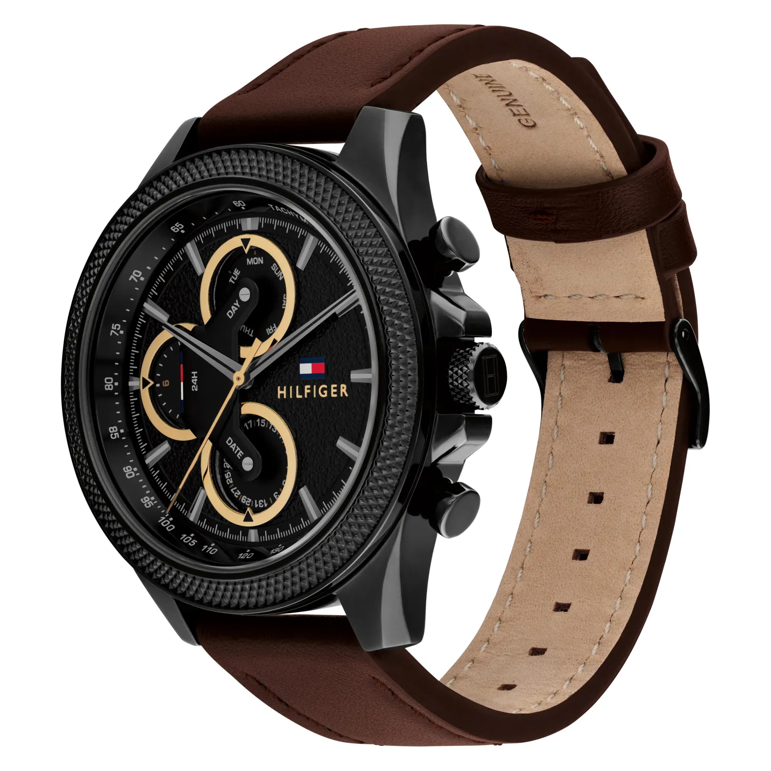 Montre Homme Tommy Hilfiger Réf 1792164 ,Collection Clark, mouvement Analogique multifonction à quartz ,3 aiguilles, boitier en acier inoxydable Argent de 46mm avec un cadran noir sur bracelet cuir marron.